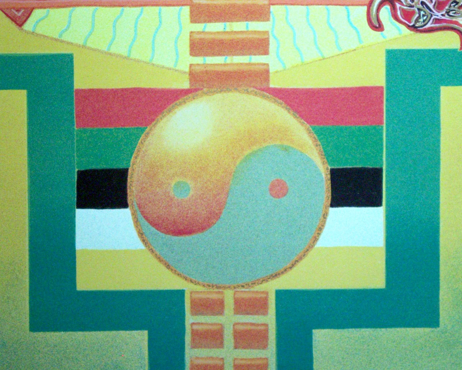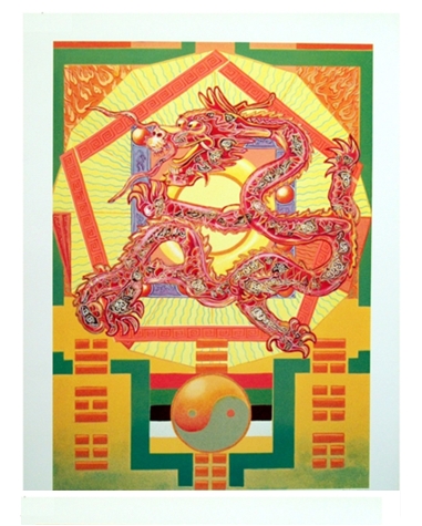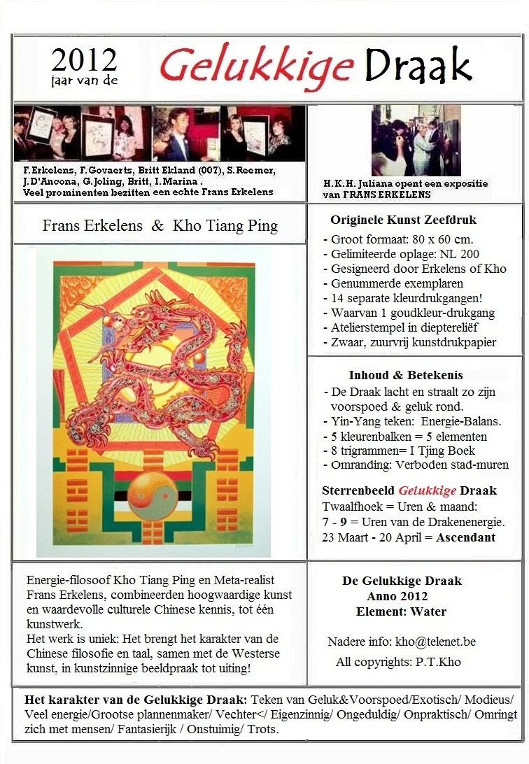 Kho Tiang Ping is een energie-filosoof. Hij vertaalt Oosterse energie-inzichten naar Westerse begrippen. In dit kunstwerk liet hij Frans de oude Chinese inzichten aangaande energie in symbolen op het schilderij van De Gelukkige Draak plaatsen.